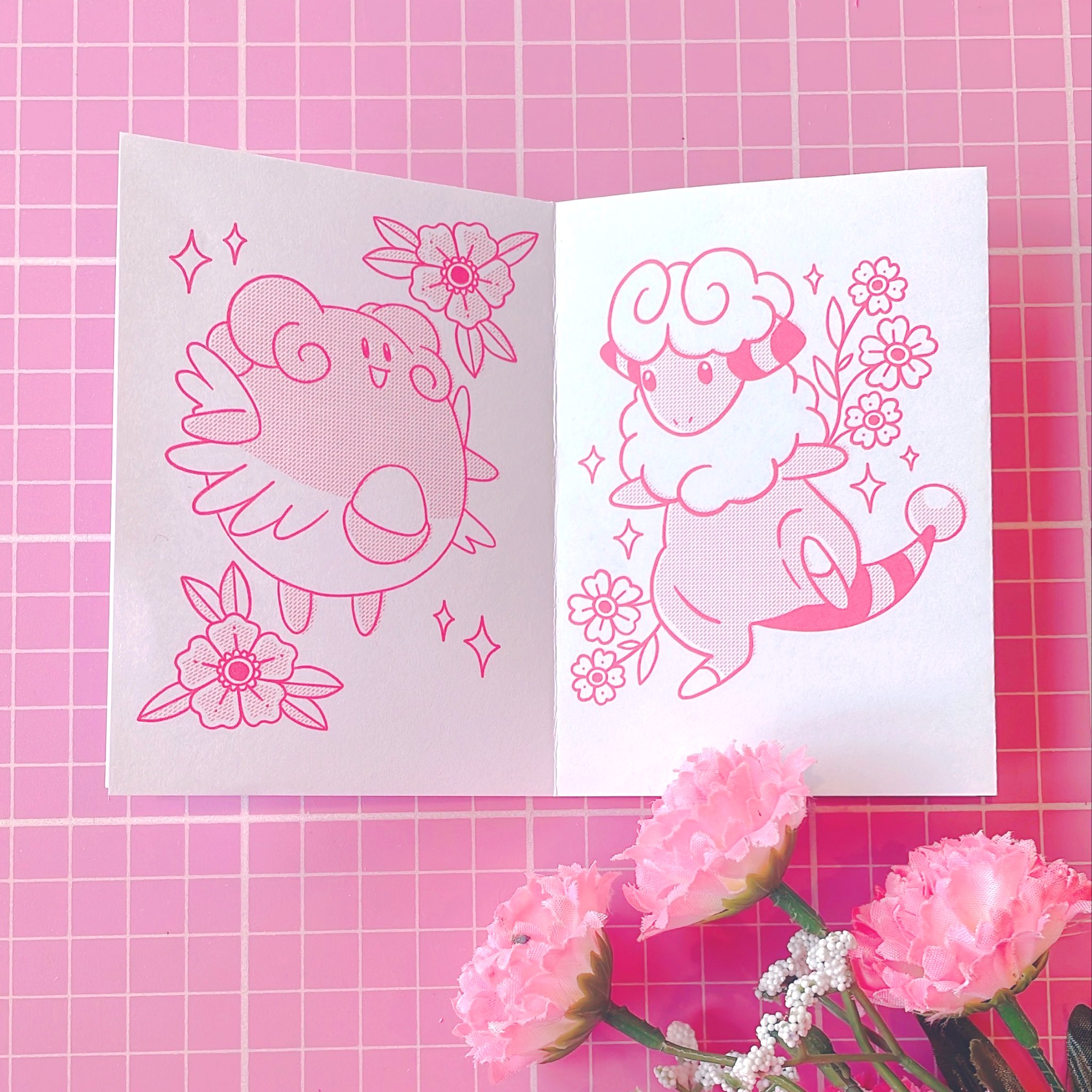 mini inkjet printed, hand folded zine of cute pink pokemon.